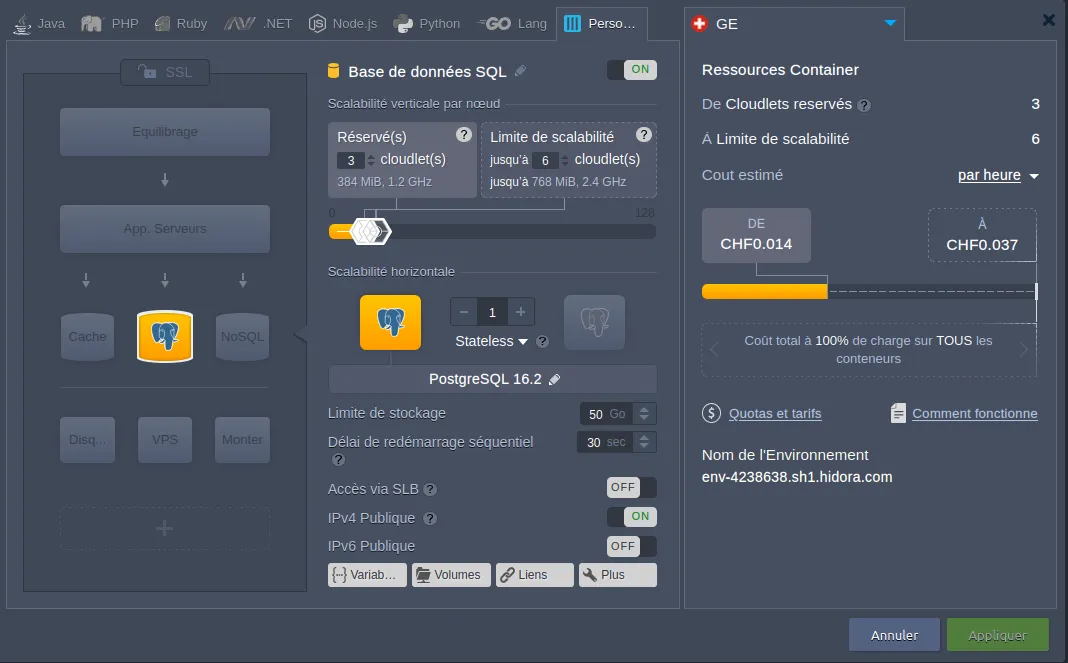 Pour utiliser Ottomatik, créez vous une instance PostgreSQL chez le fournisseur de votre choix. Pour la suite de cet article, je vais utiliser une instance PostgreSQL chez Hidora.