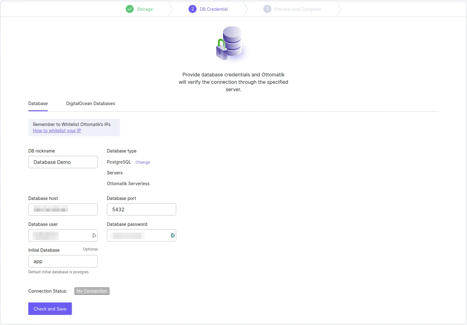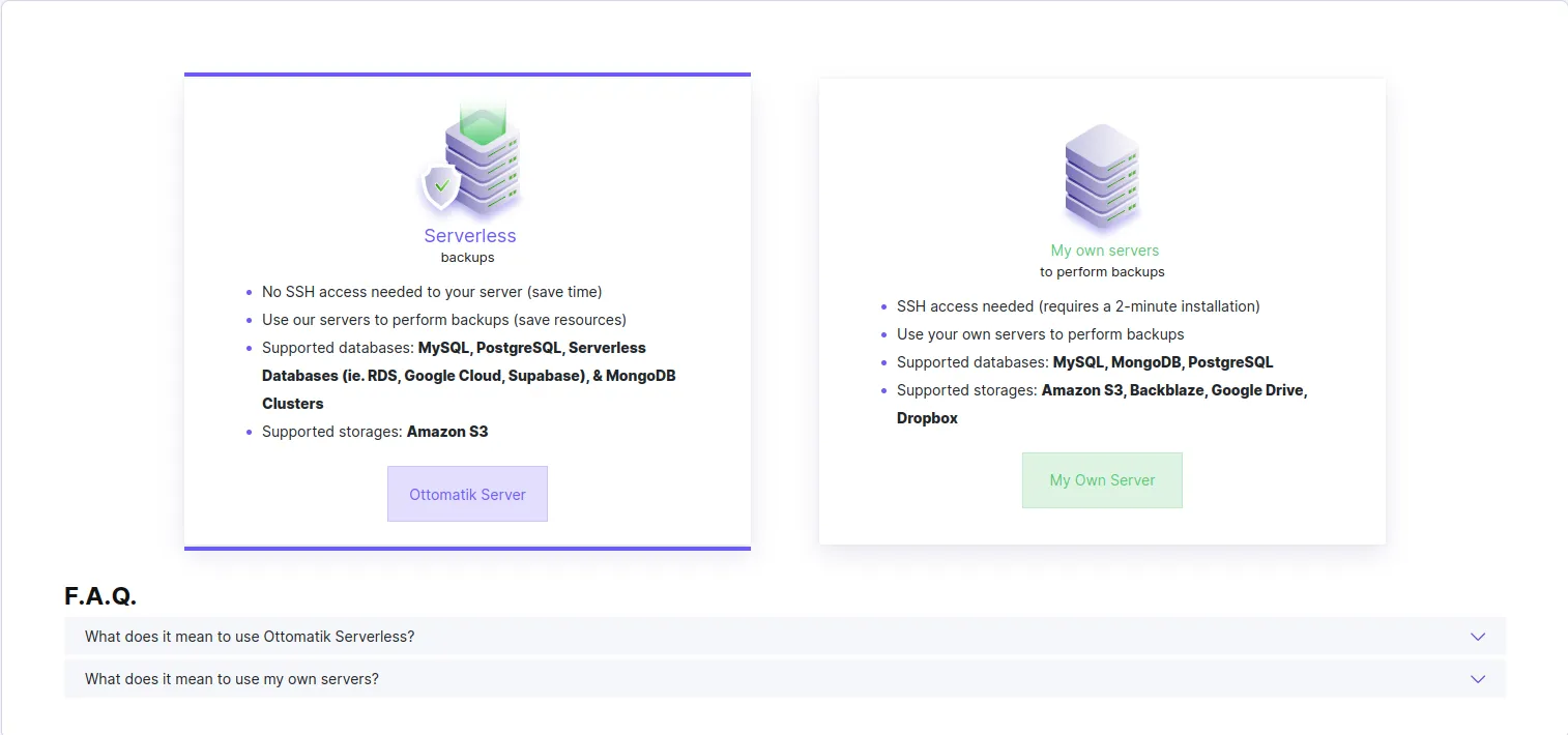 - Deuxième étape, indiquer le serveur en charge de la sauvegarde. En effet, Ottomatik propose d’éxécuter les sauvegardes sur leurs serveurs, ou sur votre propre serveur. Pour la démonstration, nous choississons les serveurs Ottomatik.