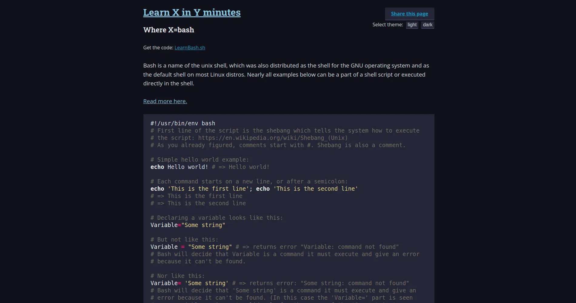 Evidement, il y a une page sur le Bash https://learnxinyminutes.com/docs/bash/ !