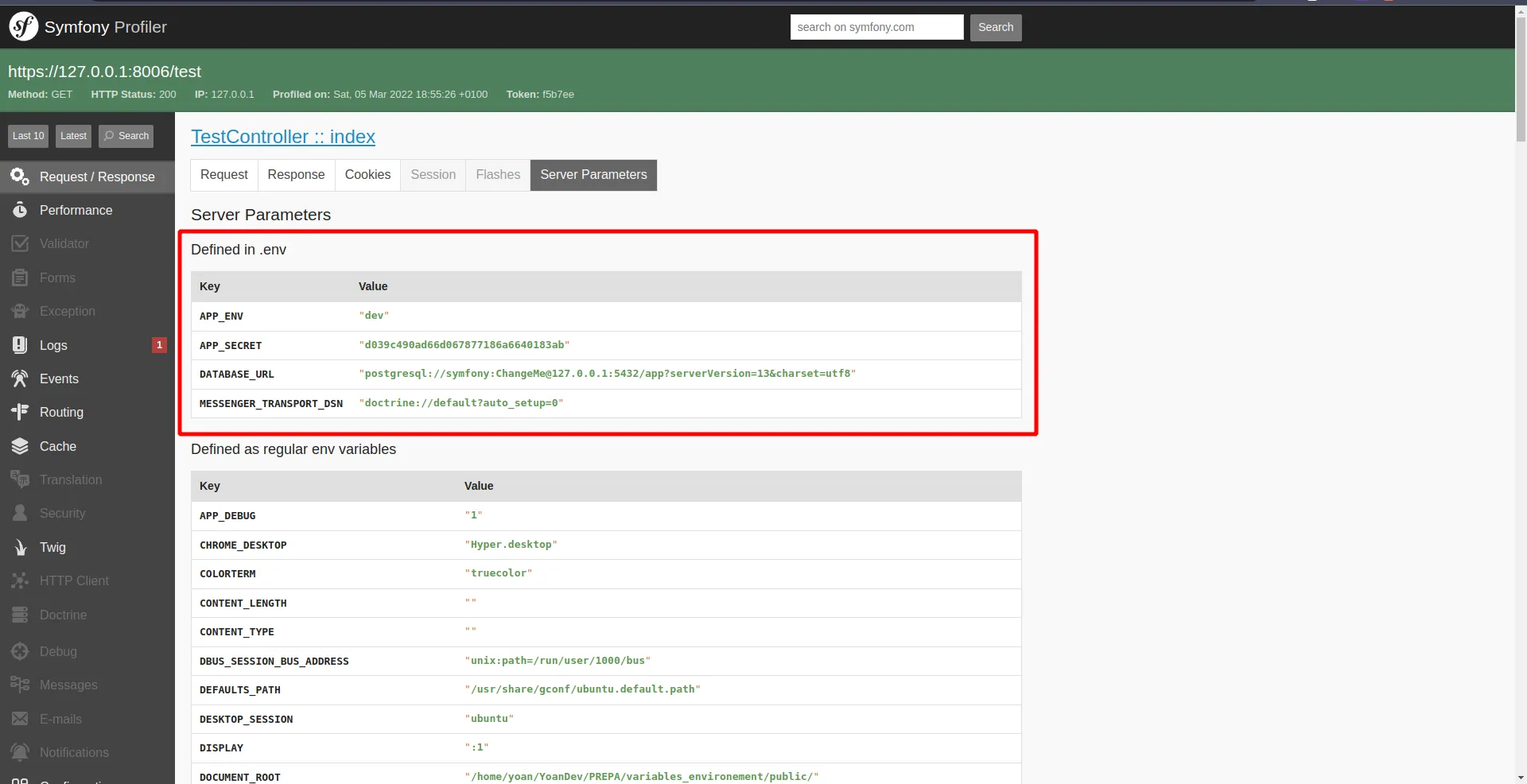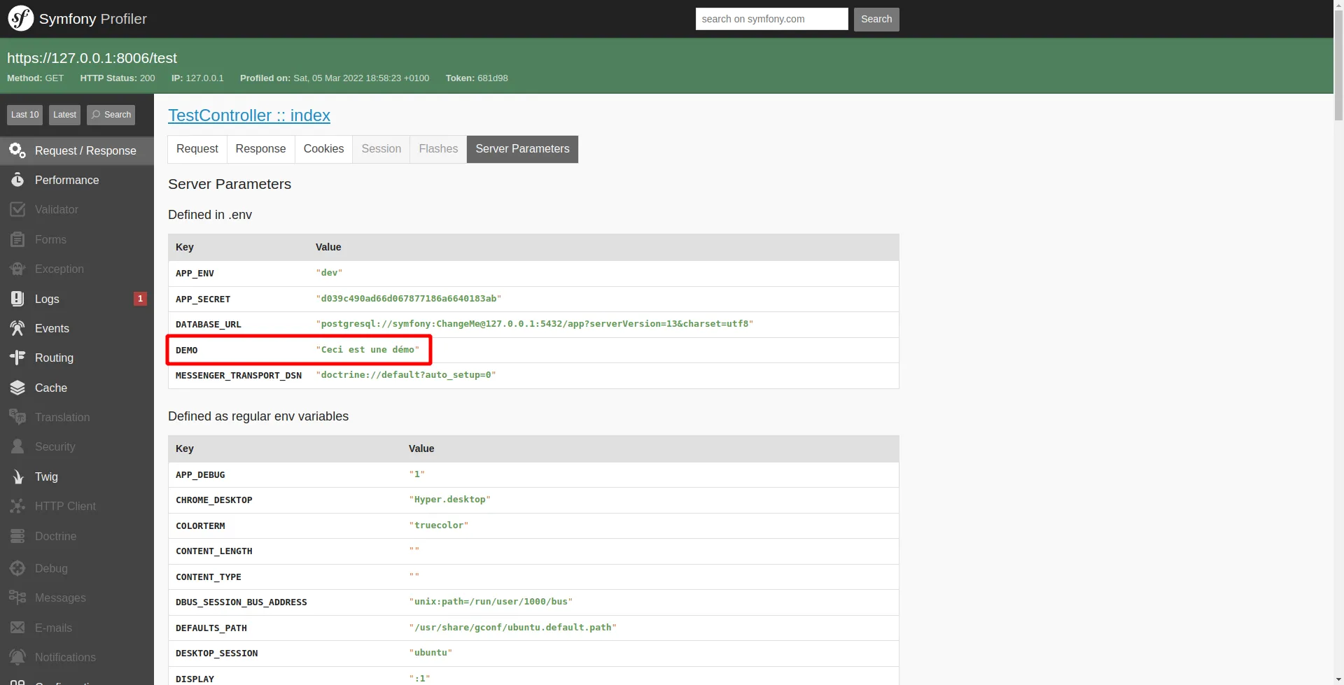 Nous pouvons checker les variables d’environnement avec la debug barre :