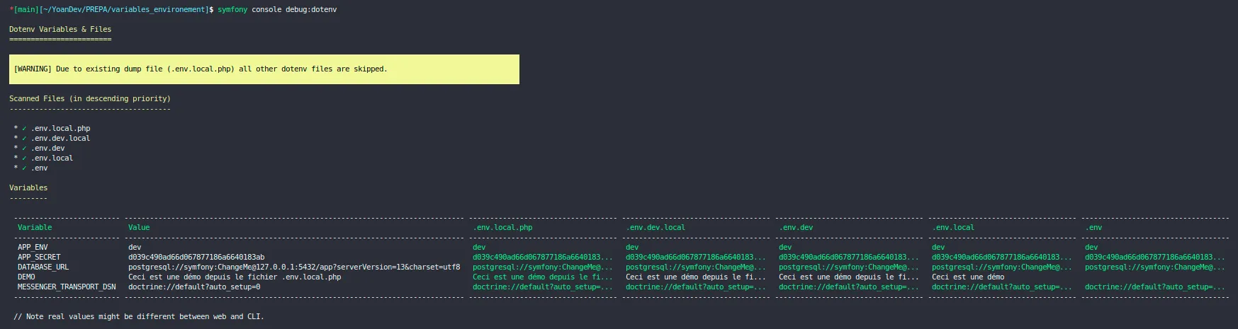 Pour des raisons de performances, noatement en production, et afin d’éviter de parser les fichiers .env à chaque requête, nous pouvons utiliser la commande dump-env pour afficher les variables d’environnement dans un fichier PHP :