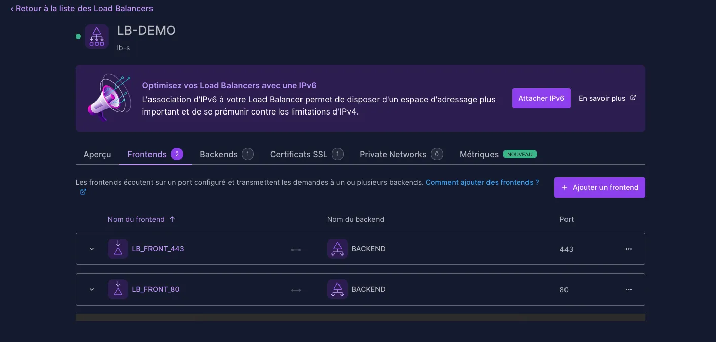 Dans la section Network > Load Balancer de notre console Scaleway, nous allons créer un nouveau Load Balancer pour répartir la charge entre nos deux serveurs.