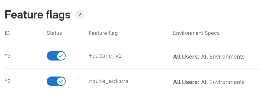 Deploy > Feature Flags, créons trois feature flags :route_active: sans conditionfeature_v2: sans conditionfeature_v3: sans condition