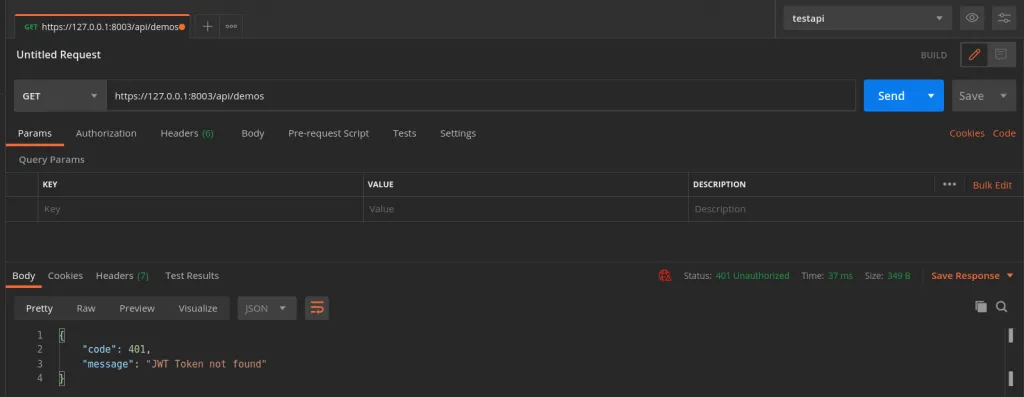 Créons une requête “should create a demo”, de type POST sur /api/demos. Il nous faut ici utiliser notre Token JWT, pour cela ajoutons le (via la variable d’environnement token dans l’onglet Authorization et Bearer Token.