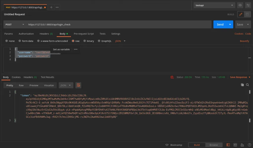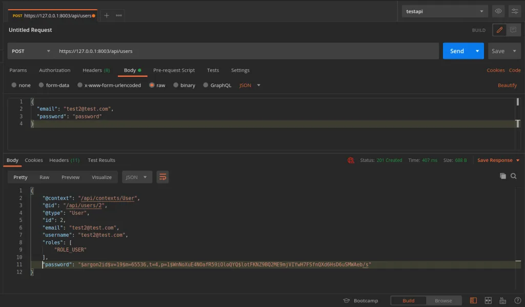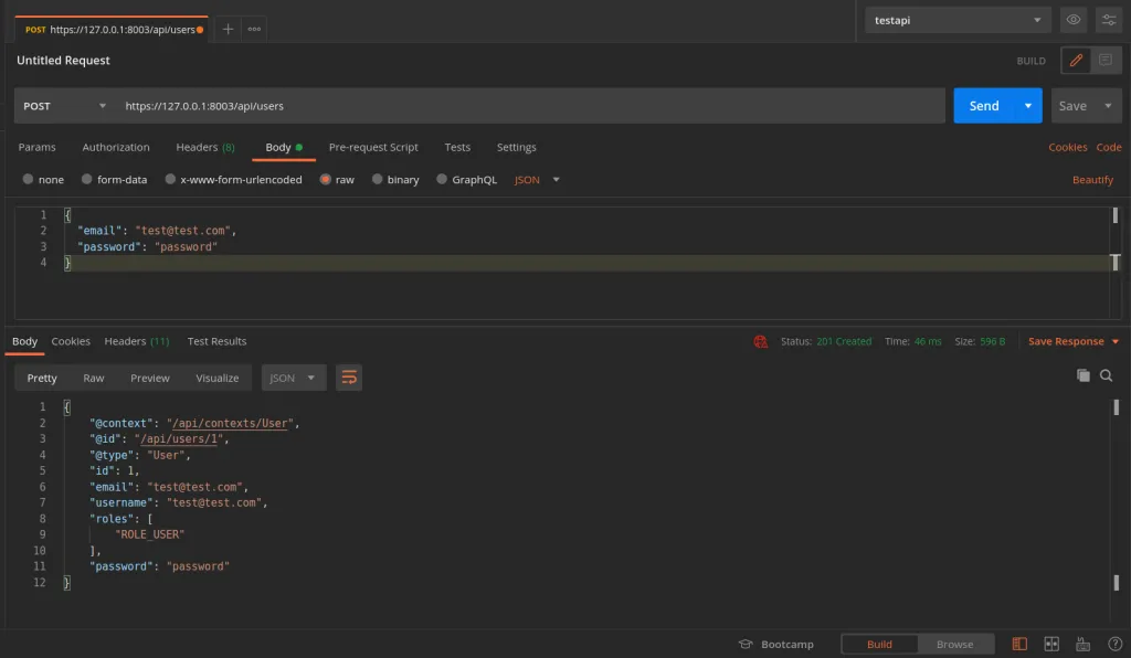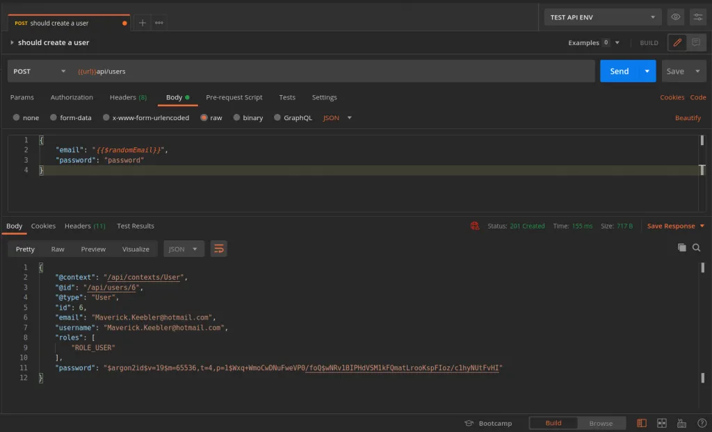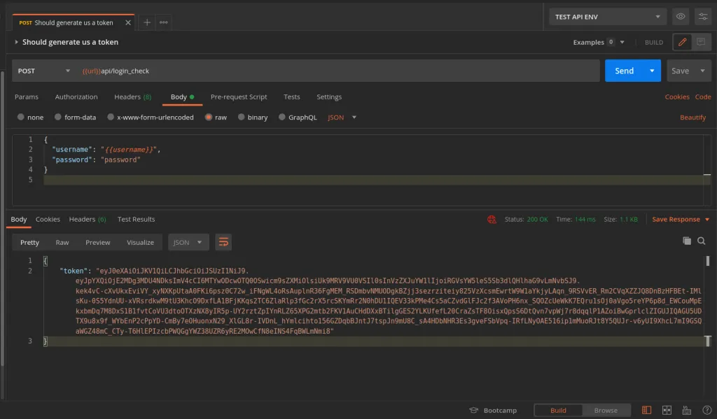 Créons une nouvelle requête “Should generate us a token” de type POST sur /api/login_check, avec le JSON suivant dans le body.
