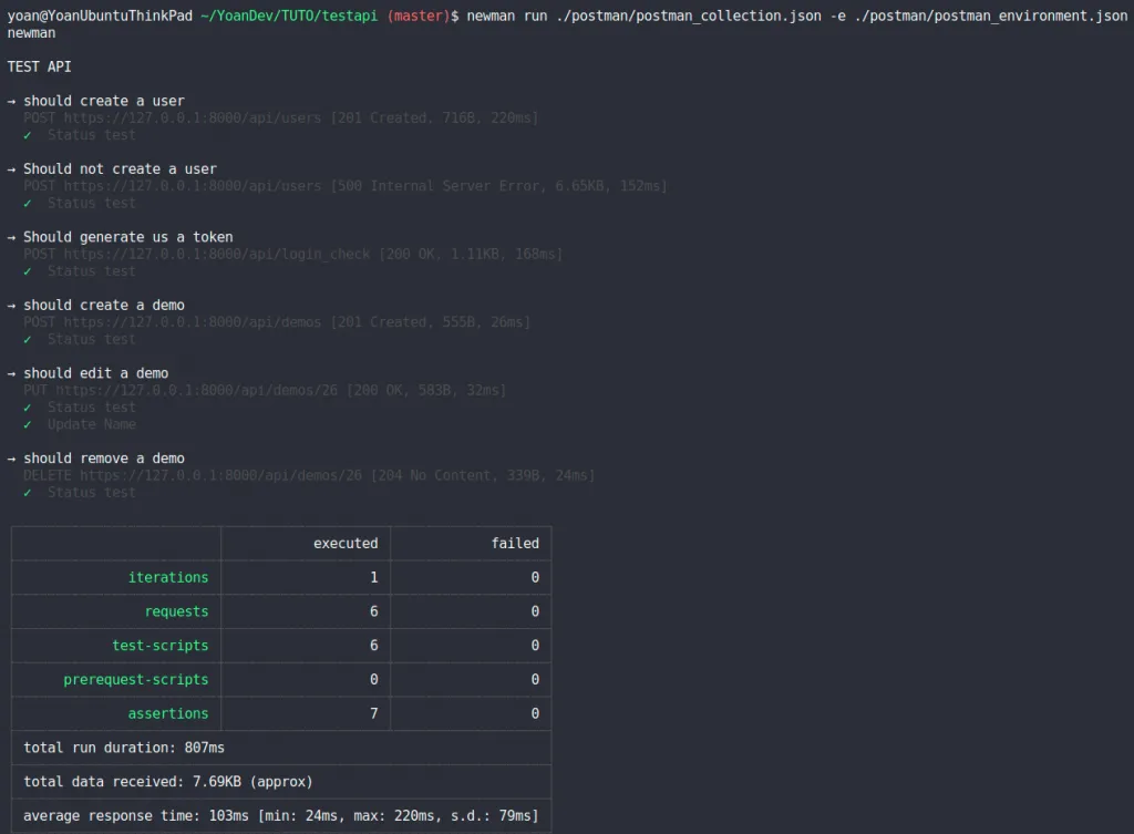 Il existe une version ligne de commande pour Postman qui se nomme Newman. L’idée c’est de jouer de manière automatique l’ensemble de nos tests (Création d’un user, récupérer un token, création d’une “démo” etc …) dans un shell (pour ensuite intégré cela dans un pipeline d’intégration continue).