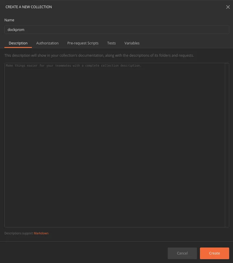 Lançons l’application Postman et créons une collection “dockprom”.