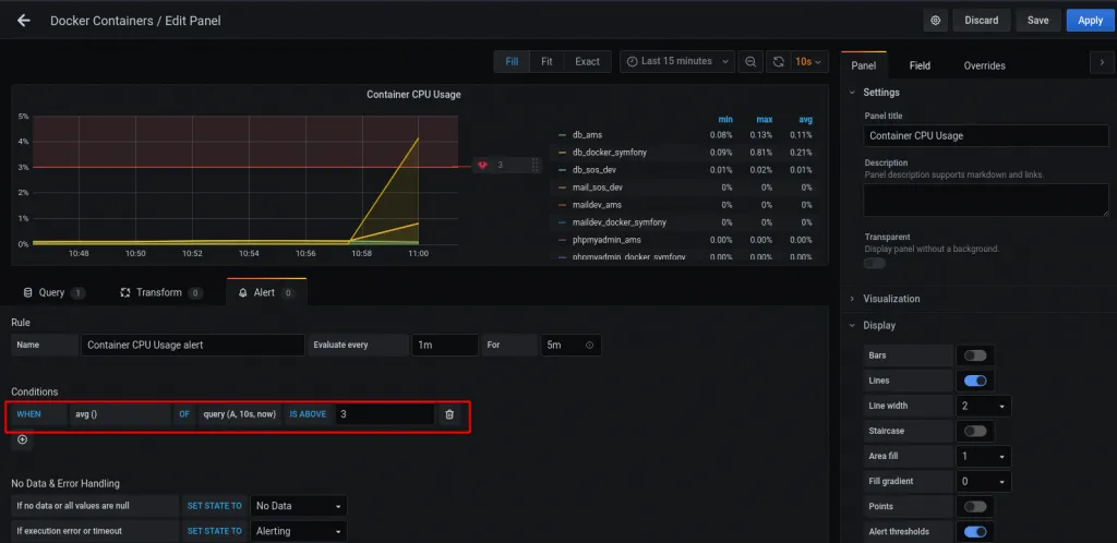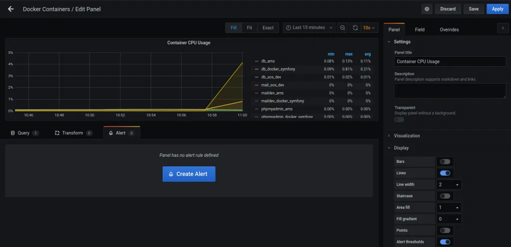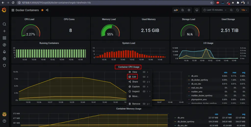 Nous allons mettre en place une alerte sur l’utilisation du CPU par nos conteneurs. Le moyen le plus simple c’est d’éditer le graphique CPU du tableau de bord “Docker Containers”.