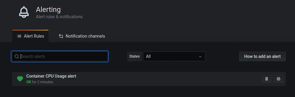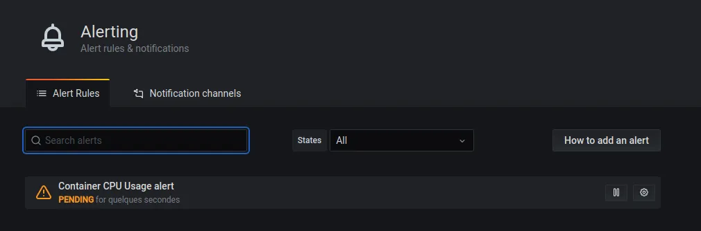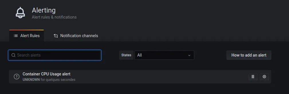 Dans la section “Alerting”, nous retrouvons l’alerte que nous venons de mettre en place.