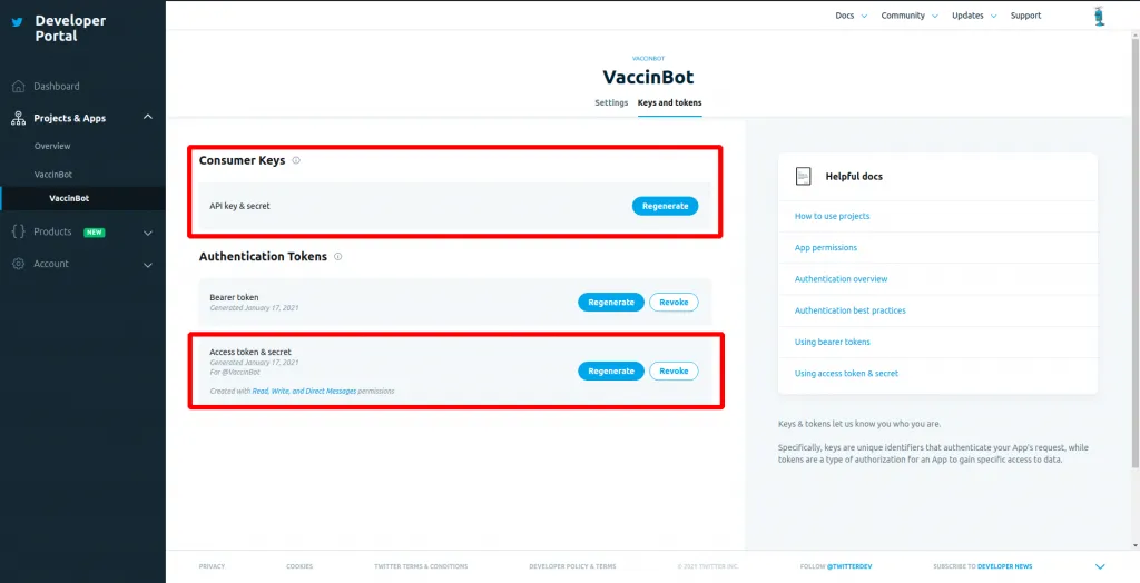 Je vous laisse réaliser cette opération seule sur https://developer.twitter.com/en et créer votre application (en lecture écriture !).