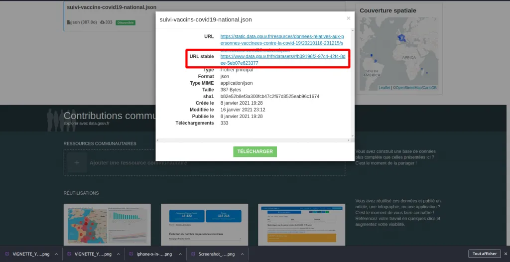 Nous utiliserons le jeu de donnée “suivi-vaccins-covid19-national.json”, dont le lien stable est :