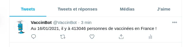 Notre objectif sera de récupérer le nombre officiel de personnes vaccinées contrela Covid 19 (sur https://www.data.gouv.fr/fr/datasets/donnees-relatives-aux-personnes-vaccinees-contre-la-covid-19/) et de publier une fois par jour (à 20h00) les données sur un compte Twitter (https://twitter.com/VaccinBot).