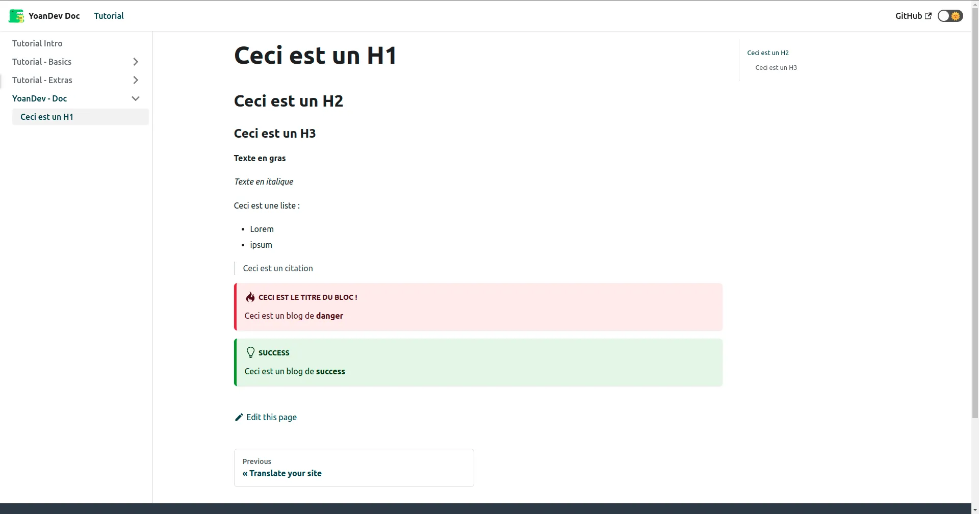 Par defaut, le projet vous montre quelques exemple de fichiers, et les quelques spécificités de syntaxe propre à Docusaurus, n’hesitez pas à y jetter uncoup d’oeil !