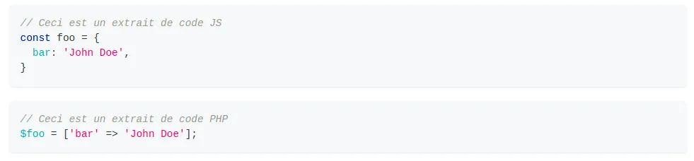 * Nous constatons que la coloration syntaxique n'est présente que pour le block de code **JS** et pour PHP.